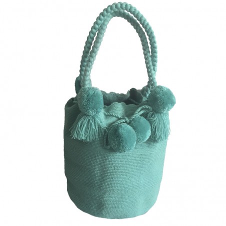 Bolso Tejido wayuú, unicolor, con asas en trenza y hermosos pompones. Elaborado por la Etnia Wayuú, Guajira - Colombia.