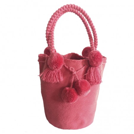 Bolso Tejido wayuú, unicolor, con asas en trenza y hermosos pompones. Elaborado por la Etnia Wayuú, Guajira - Colombia.